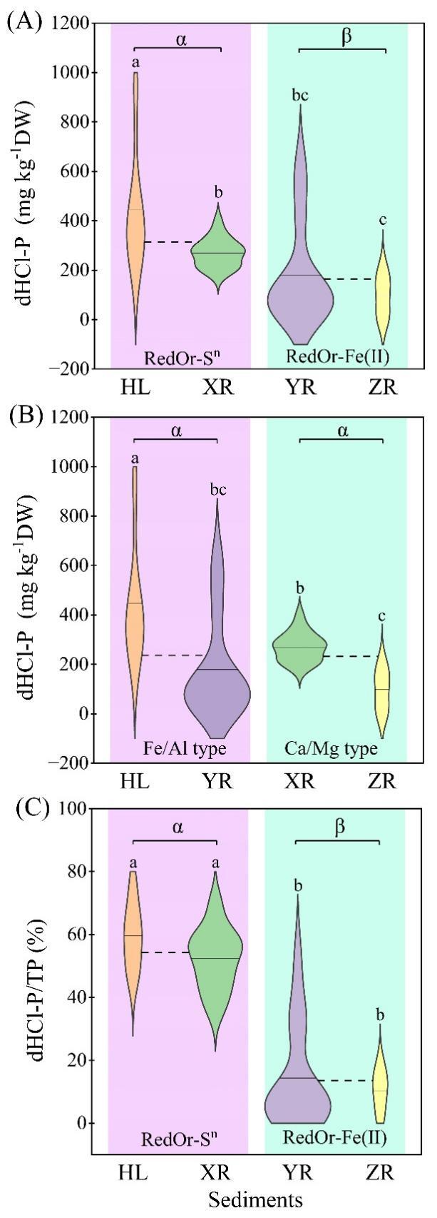 结果表明,dHCl-P 含量主要受沉积物还原类型控制,而非简单取决于沉积物总磷含量或基质类型(图1)。与有机-亚铁型(RedOr-Fe(II) 型)沉积物相比,有机-硫化物型(RedOr-Sn 型)沉积物具有更高的 dHCl-P 含量,显示出更强的内源磷释放潜力。
