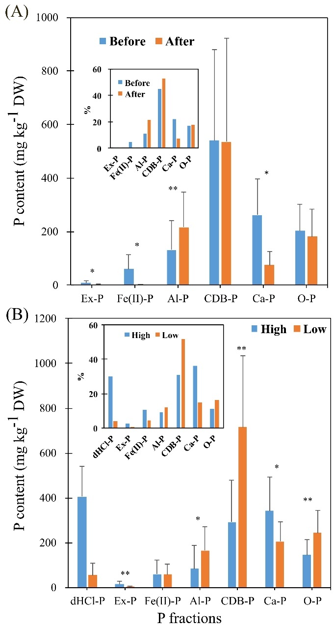 图2. dHCl-P的磷形态组成. (A) dHCl-P提取前后沉积物磷的形态分布。(B) 高dHCl-P组(dHCl-P > 200 mg kg-1 DW)和低dHCl-P 组(dHCl-P < 200 mg kg-1 DW)沉积物磷的形态分布