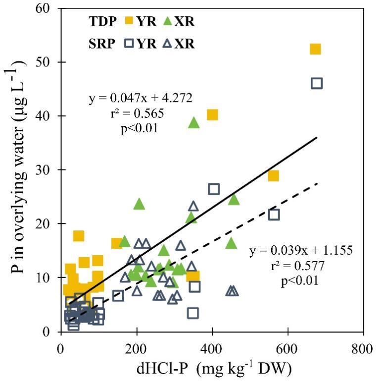 图3. dHCl-P与上覆水中总溶解磷(TDP)和溶解活性磷(SRP)的关系(以峡山水库和渔洞水库为例).