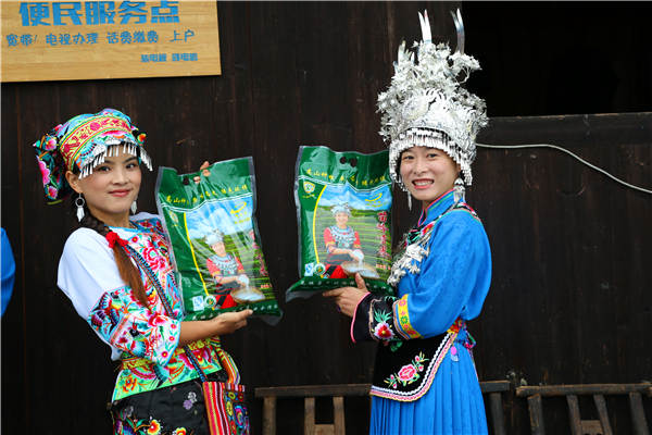 美丽的湖南省花垣县十八洞村姑娘展示苗岭贡米。王振红摄