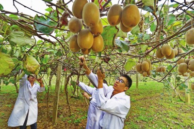 · 图片说明: ▲科研人员密切观测猕猴桃良种长势。