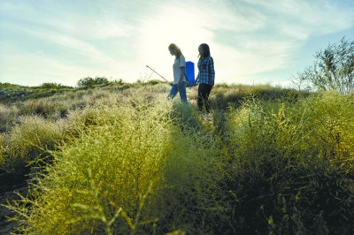 8日下午,顶着3时多的太阳,韩迎春和李琪背着40斤的水桶,走上20多分钟,进入到丛林深处的沙地,经过近20年荒漠藻种植,基地周边已形成高高低低的灌木丛林,要找上一片未被荒漠藻覆盖的沙地,的确不容易。