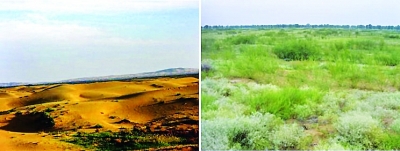 达拉特旗荒漠化综合治理试验站治理前景观,左拍摄于2001年记者 胡冬冬 翻拍
