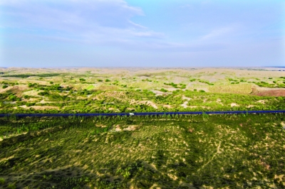 2017年9月8日,距内蒙古林业科学研究院沙漠试验基地20多公里远的解柴线公路两旁仍有大片的草地,地面也显现出灰绿色。这是荒漠藻结皮后的成果,再向远处则是泛黄的绵延不绝的沙丘 记者 胡冬冬 摄