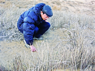 2008年12月,中科院武汉水生所专家刘永定实地观察荒漠藻结皮效果记者 胡冬冬 翻拍