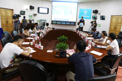 活动期间,大家观看了小江豚出生的纪录短片。郝玉江副研究员介绍了长江江豚人工饲养繁殖工作的进展,王丁研究员介绍了长江豚类保护的现状和展望。在参观采访环节,媒体记者现场观看了训练员与江豚的互动,并就相关问题与科研人员进行了深入的沟通交流。