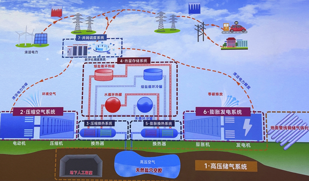 湖北应城的采盐史最早可追溯到明清时期,遗留下的盐穴较多。此次运行的300MW压气储能电站示范工程,由武汉岩土所杨春和院士团队选定具备地质条件的废弃盐矿洞穴建设储气库,将用电低谷时电网中富余的电能转换成压缩空气势能存在储气库中,在用电高峰时释放压缩空气势能转换为电能。是目前已全面投用的单机功率世界第一、储能规模世界第一、转换效率世界第一的300MW盐穴压缩空气储能电站示范工程。它被形象地比喻为一个“超级‘充电宝’”——单机功率达300MW级,储能容量达1500MWh,系统转换效率约70%,每天储能8小时、释能5小时,年均发电约5亿千瓦时。以空气为介质,转化的电量可以满足75万居民一年的用电需求,可有效应对新能源发电的波动性、间歇性和随机性。
