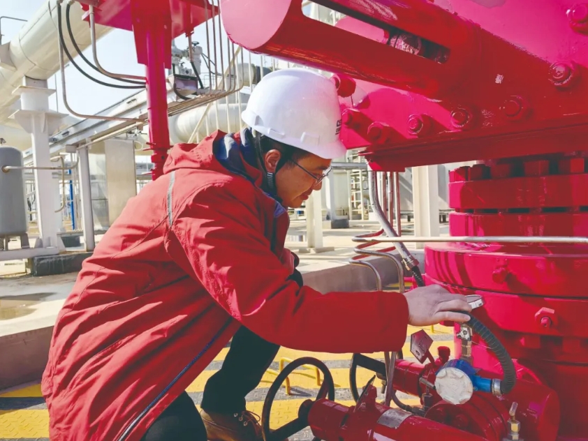 马洪岭在查看注采井上的表盘。倪思洁/摄