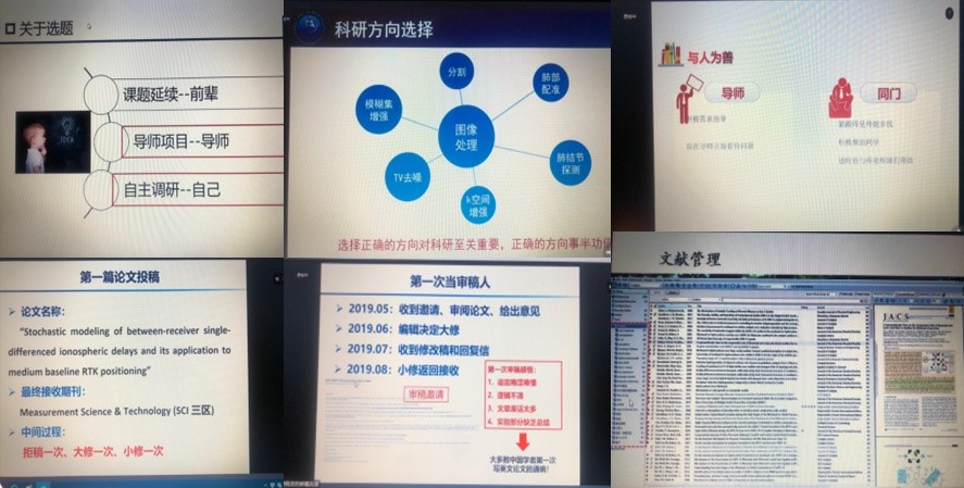 武汉大学博士毕业生吴平,精密测量院博士毕业生王坤鹏、段曹辉,在学博士生王生亮、糜晓龙、胡敏分享了自己的科研经历及心路历程。吴平介绍了有效与导师沟通的方法并分享了自己进行交叉学科研究的经验。王坤鹏结合自己发表学术论文的实践,谈到虽然科研道路并不总是一帆风顺,但作为研究生要有迎难而上的精神,要志存高远,更需脚踏实地。段曹辉总结了在进行科学研究中总结、交流和合理分配时间的有效做法。王生亮向大家介绍了科研选题的三种途径和高效阅读文献的方法。糜晓龙结合自己第一篇英文论文的发表过程、以及第一次当审稿人的经历,介绍了论文写作、投稿的方法和技巧。胡敏着重介绍了如何高效地查找文献和管理文献,并展示了高效率获得目标文献的小技巧。在提问环节中,各位报告人对大家提出的问题进行了详细的解答,整个会议进程平稳有序而又轻松愉快。蔡怡春最后总结讲话,感谢了各位报告人的精彩分享、各位同学的踊跃参与以及研会全体成员为举办本次活动的辛苦付出。