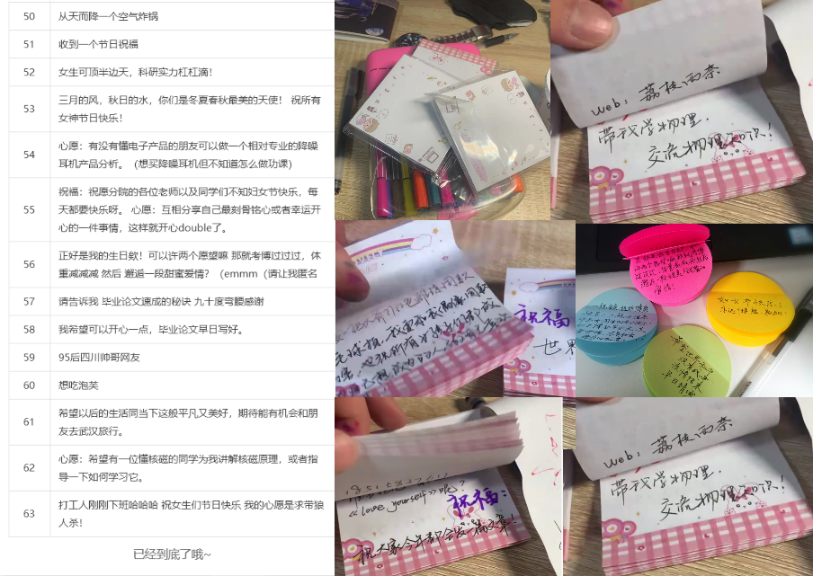祝福:主演分院的各位老师以及同学们不止妇女节快乐,每天都要快乐呀。心愿:互相分享自己最刻骨铭心或者幸运开心的一件事情,这样就开心double了。