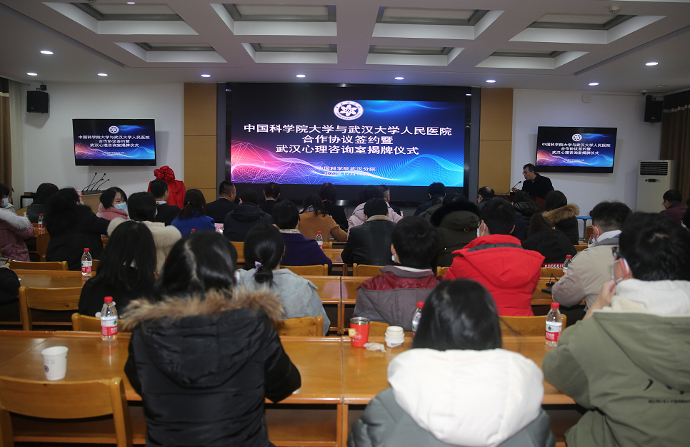 为深入贯彻落实教育部《高等学校学生心理健康教育指导纲要》,逐步满足武汉地区培养单位日益增长的心理健康服务需求,落实国科大“大思政”的工作格局,12月16日,中国科学院大学与武汉大学人民医院于武汉分院举行合作协议签约暨武汉心理咨询室揭牌仪式。中国科学院大学副校长牛晓莉,武汉大学人民医院院长王高华、党委副书记余锂镭,武汉分院分党组副书记蔡长塔等共同参加本次活动。武汉分院教育处处长杜永成担任主持人。