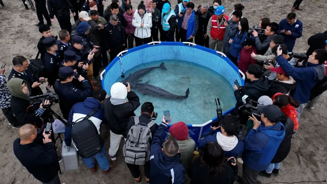 工作人员将江豚转运至人工蓄水池内等待放归(图片转自武汉发布)