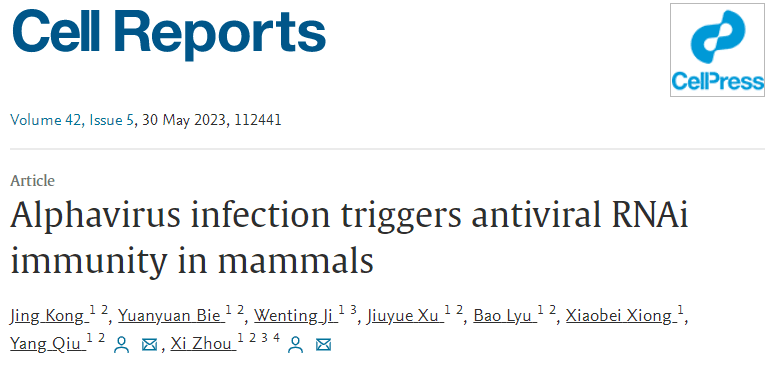 2023年4月,中国科学院武汉病毒研究所/病毒学国家重点实验室周溪/邱洋团队在国际学术期刊Cell Reports发表了题为“Alphavirus infection triggers antiviral RNAi immunity in mammals”的研究论文。该研究首次发现野生型甲病毒感染哺乳动物体细胞及成年小鼠可以有效激发RNA干扰(RNAi)介导的抗病毒免疫,拓展了我们对哺乳动物中RNAi抗病毒免疫的认识。
