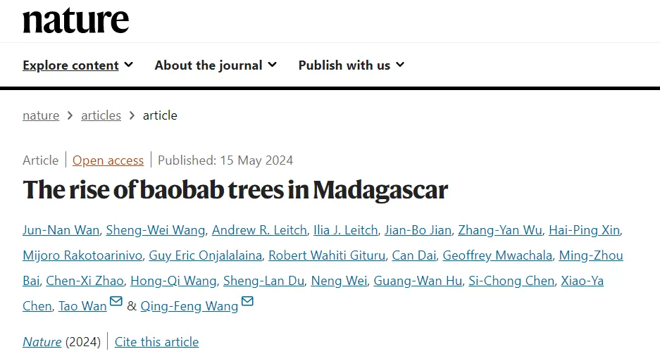 2024年5月15日,由中国科学院武汉植物园/中国科学院中-非联合研究中心(以下简称“中-非中心”)牵头,联合英国伦敦玛丽女王大学、英国皇家植物园邱园、华大基因、马达加斯加塔那那利佛大学、肯尼亚国家博物馆、上海辰山植物园等科研机构,在《自然》杂志(Nature)发表了题为“The rise of baobab trees in Madagascar”的研究论文,系统阐明了全球关注的濒危植物类群——猴面包树属的多样性演化历史,提出马达加斯加应为该属的起源分化中心,研究通过综合遗传、生态、地理数据分析,重点揭示了马达加斯加猴面包树历史种群动态变化的驱动因素,并就其未来保护提出科学、有效的保护策略及建议。