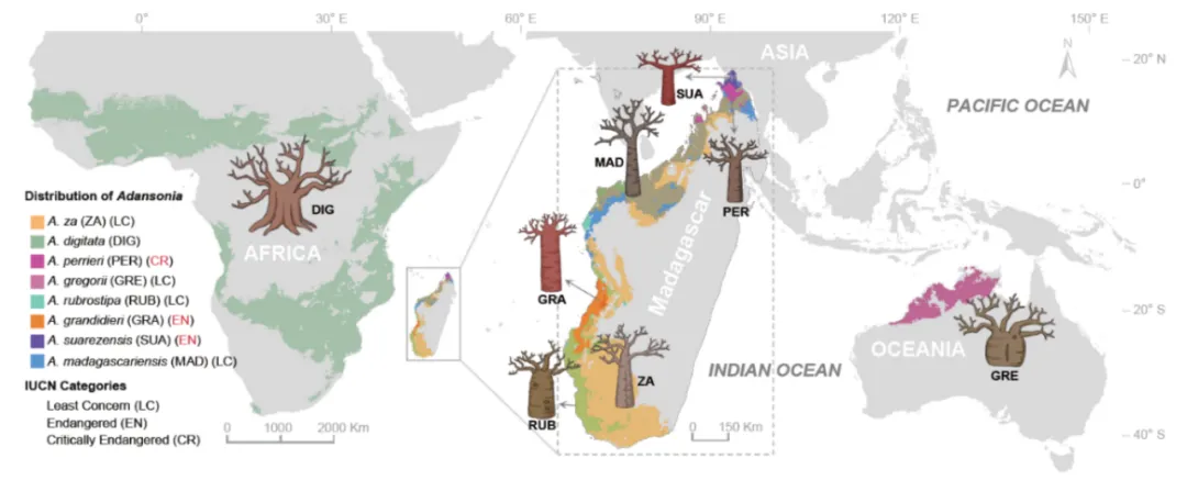 图1. 猴面包树属植物现今全球分布格局及IUCN濒危保护等级