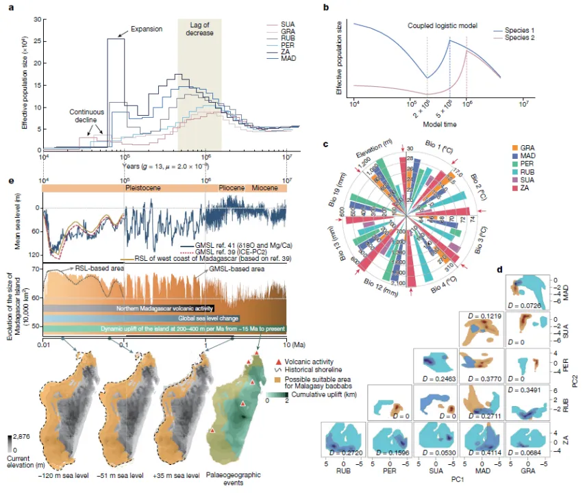 图4. 马达加斯加猴面包树种群变化历史及其受地质事件、海平面变化等的影响