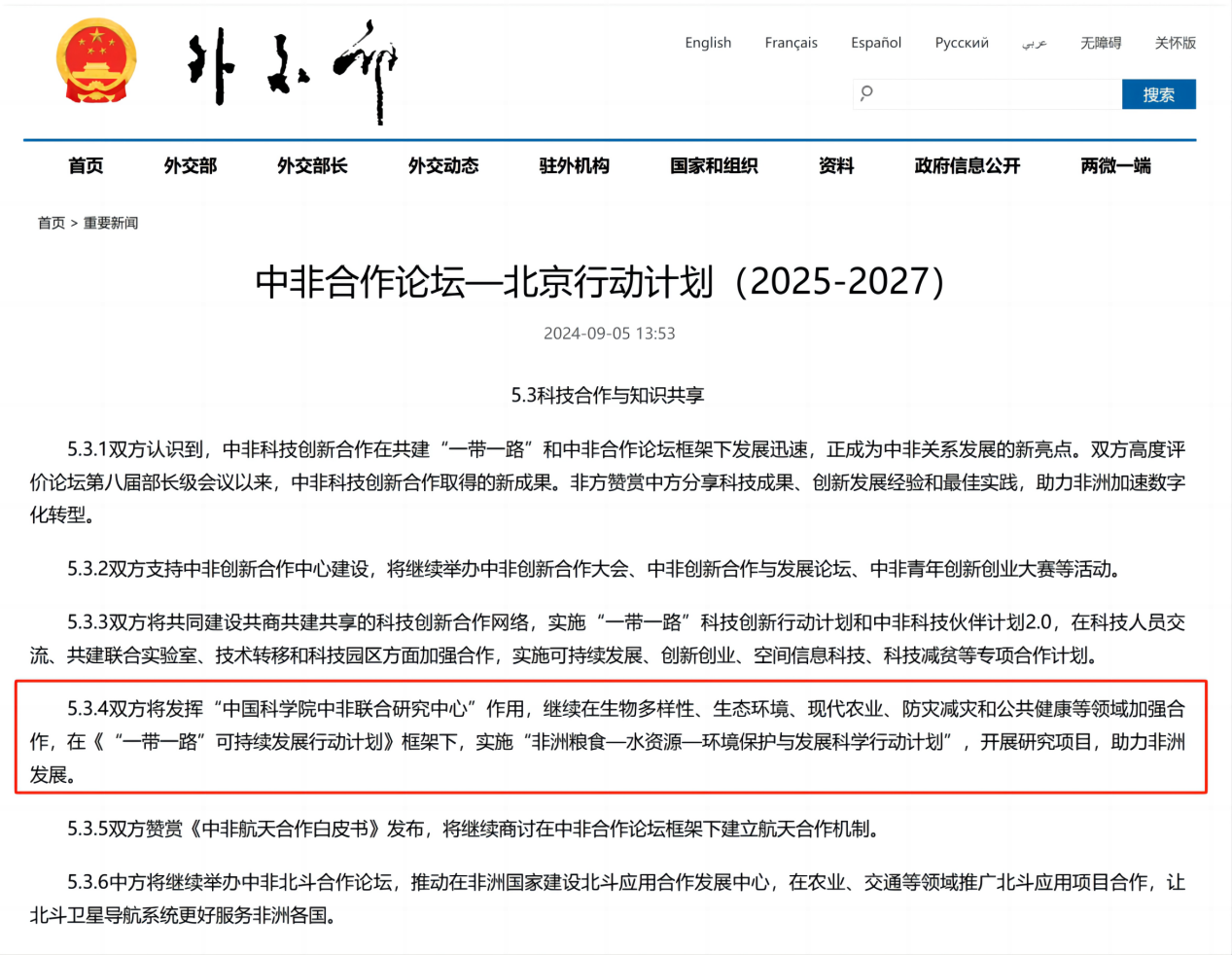 行动计划第5.3.4条提出,双方将发挥“中国科学院中非联合研究中心”作用,继续在生物多样性、生态环境、现代农业、防灾减灾和公共健康等领域加强合作,在《“一带一路”可持续发展行动计划》框架下,实施“非洲粮食—水资源—环境保护与发展科学行动计划”,开展研究项目,助力非洲发展。