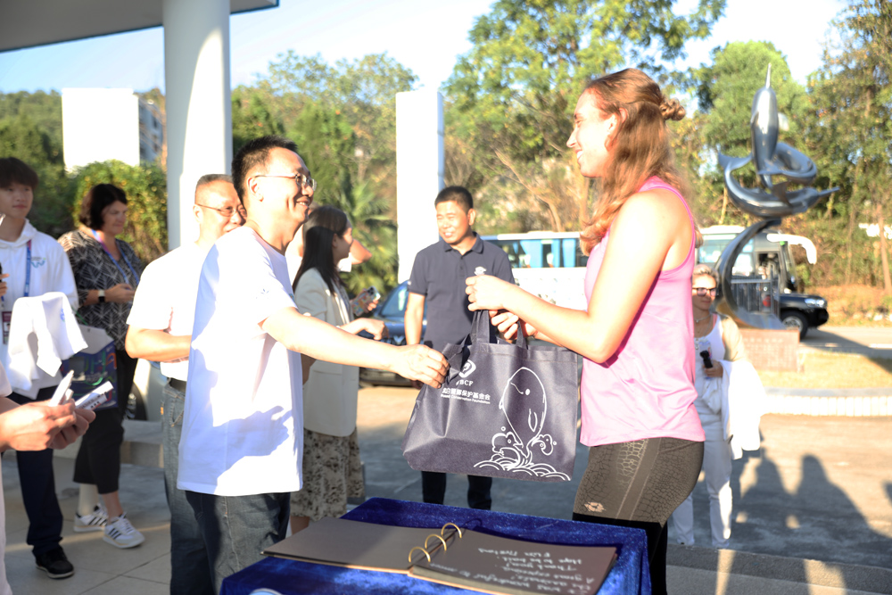参观结束后,缪炜所长、解绶启书记代表水生所向球员们赠送了江豚礼品。球员们在纪念品上签名,在留言本上写下对江豚的祝福。