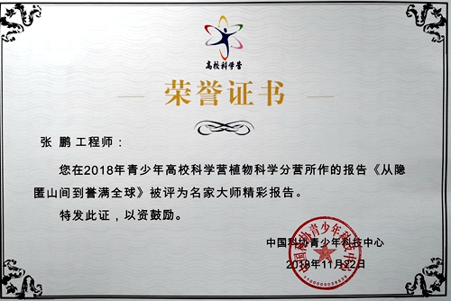 青少年高校科学营由中国科协、教育部共同举办,是国内目前层次最高、规模最大、覆盖面最广的青少年科技创新夏令营,包括53个由高校承办的常规营和14个科研院所及企业承办的专题营,武汉植物园是全国唯一一个承办“植物科学”专题营的科研机构。作为全国唯一一个承办“植物科学”专题营的科研机构,武汉植物园已经是第五年开展“植物科学”专题营活动,为青少年搭建了了解植物科学的重要平台。为鼓励各承办单位,针对科学营活动内容,中科协每年会设置《特色营队活动案例》和《名家大师精彩报告》两个奖项,武汉植物园曾两次荣获 《特色营队活动案例》奖,今年是首次荣获《名家大师精彩报告》奖项。武汉植物园将继续结合园区科研资源、深挖科普内涵、开拓科普工作格局,举办有特色、有影响力的“植物科学”品牌活动,让更多的公众走进科学、了解科学、热爱科学、投身科学。