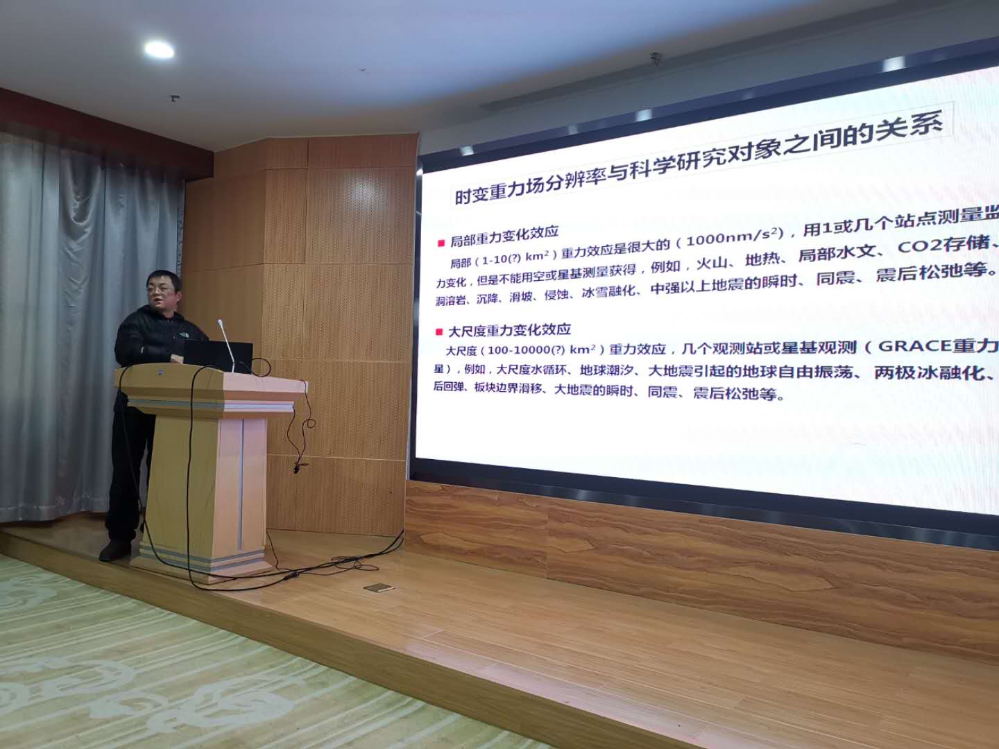 首先,王勇研究员作了“光钟在重力场研究中的应用展望”专题报告,从重力位基础理论导出,详细介绍了常用地球重力场确定方法及其在大地测量、海洋学和地球物理学中的具体应用,以及相对论大地测量的研究现状和未来发展趋势,并对未来高精度光钟在区域大地水准面精化、全球高程基准统一、垂直参考框架建立、厘米级地壳垂直运动、区域重力位连续测量以及地下物质迁移过程的监测等诸多大地测量研究热点问题中的应用,展开了深入的探讨。