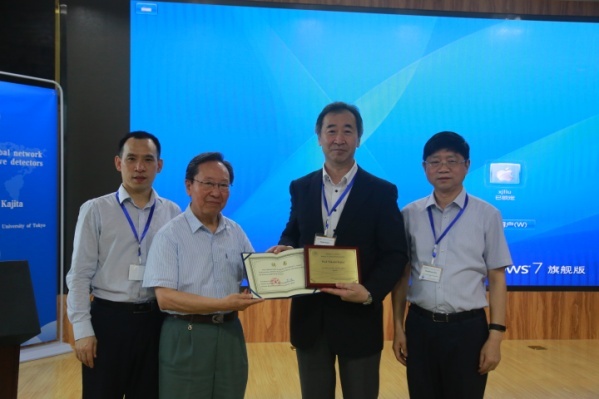 向梶田隆章教授颁发了“王天眷讲坛讲席教授”的聘书和铭牌