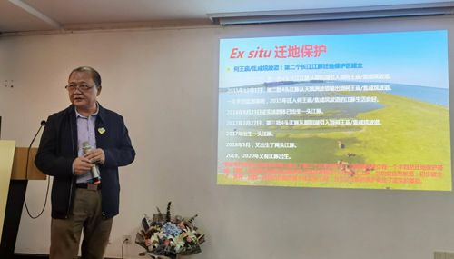 鲸类保护生物学学科组王丁研究员深情回忆了我国长江濒危豚类保护工作逾40年艰难而辉煌的历程。他表示,在政府的支持下,在水生所等单位的共同努力下,长江江豚迁地保护工作已取得显著成效,降低了物种灭绝的风险,但就地保护依然是长江江豚物种保护的关键;2017年的科考结果发现长江江豚自然种群快速下降的趋势在一定程度上得到了遏制,表明我国政府实施的长江大保护策略取得了初步成效,长江江豚保护前景可期。特别是,武汉江段已有十多年未见野生江豚的踪影,但是今年8月份起,江豚多次在武汉江段现身。水生所正在与武汉市相关部门联合推动“江豚重返武汉江段项目”,希望通过环境改造和栖息地质量提升等手段让江豚常驻武汉江段,让武汉市民们在家门口就能经常看到江豚。