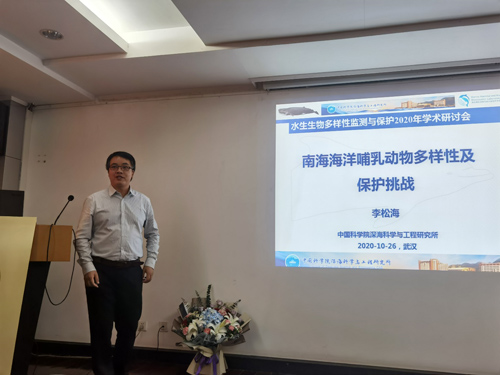 中科院深海科学与工程研究所李松海研究员(2007届所友,师从王丁研究员)回顾了在水生所攻读学位期间的难忘时光,并分享了其目前从事的南海海洋哺乳动物研究。他在报告中介绍,南海是我国鲸类生物多样性最丰富的的海域,并且他们团队近几年在海南岛西南部海域发现一个比较稳定的、数量较大的中华白海豚群体,这对开展南海海洋生态环境保护具有重要意义。同时他建议通过开展科学调查、加强国际合作及提高宣传教育等途径保护水生生物多样性。