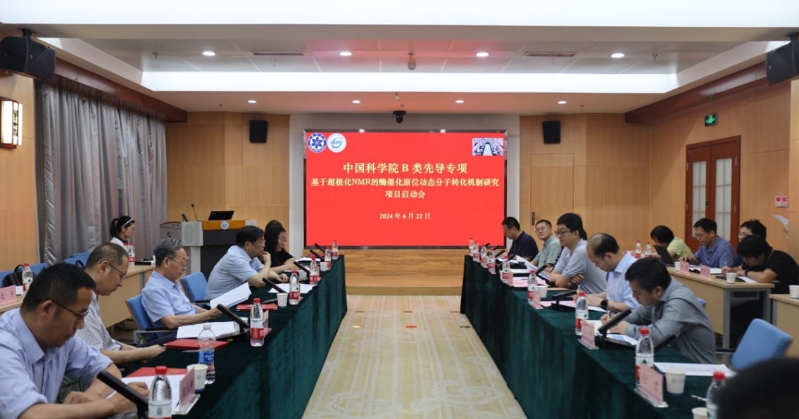 6月22日,由精密测量院牵头承担的中国科学院B类先导专项“基于超极化NMR的酶催化原位动态分子转化机制研究”启动会在武汉召开。中国科学院院士叶朝辉、张玉奎、刘买利等项目科学咨询指导组专家,中国科学院前沿局物理与化学处项目主管贺鹏,中国科学院院士、精密测量院副院长倪四道,专项负责人研究员李从刚,各项目负责人及参研科研骨干,相关管理部门负责人等60余人参会。