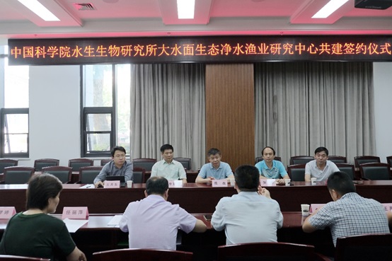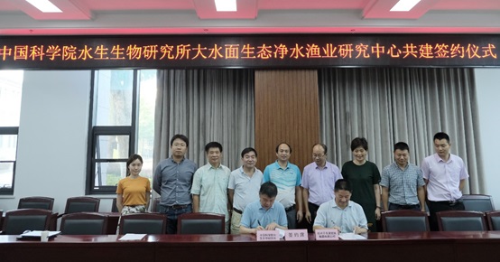7月2日,中国科学院水生生物研究所(以下简称水生所)大水面生态净水渔业研究中心(以下简称大水面生态净水渔业中心)共建签约仪式在武汉举行。该中心由水生所与淳安县人民政府、杭州千岛湖发展集团有限公司(以下简称千发集团)在杭州市淳安县共建。水生所副所长(主持工作)殷战、千发集团总经理何光喜代表双方签约。水生所科研处处长贺锋、李钟杰研究员、刘家寿研究员、千发集团渔业部部长邵建强等出席签约仪式。