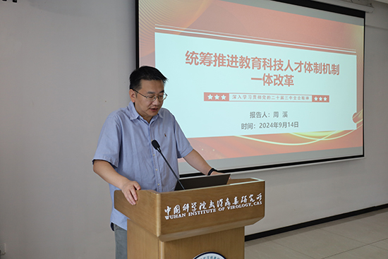 最后,肖庚富作总结讲话。他对抓好贯彻落实提出三点要求:一是原原本本学,要认真学习领会党的二十届三中全会精神,对《决定》提出的60条、300多项重要改革举措,力求学深悟透、融会贯通。二是深入研讨学,《决定》内容具体有力、可触可感,要通过研讨交流促学习促思考,有新认识新体会,迅速掀起学习热潮。三是联系实际学,要把学习领会党的二十届三中全会精神和学习领会中国科学院夏季党组扩大会议精神结合起来,将学习成果转化为抢占科技制高点的强大动力,在研究所的改革创新发展过程中拿出真招实招硬招,为实现我国在高致病性病毒与生物安全领域高水平自立自强作出武汉病毒所的贡献。
