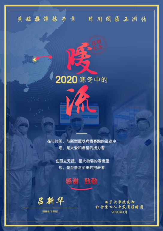 吕新华是武汉文献情报中心《长江流域资源与环境》编辑部主任、南京大学湖北校友会秘书长。作为一名老党员,他时刻以党员的标准严格要求自己,处处起先锋模范作用。“党员就是要在关键时刻站得出来,危险时刻挺得出来。”这是经常挂在吕新华嘴边的一句话。连日来,他积极协调各方,与南京大学加拿大、美国、日本及国内多家校友会广泛联系,为校友募捐对口支援武汉提供直接的咨询意见;为南京大学、密歇根州立大学与武汉病毒所开展合作研究牵线搭桥;为南京大学“众志成城心系武汉”项目、校友及社会爱心人士“直达黄冈楚天舒”项目捐款各500元;参与南京大学杨晓湖校友团队组织的3期校友及社会爱心人士对口支援湖北爱心捐赠活动,共募集超过100万元防护物资,定向捐助给省人民医院、武汉市三医院、七医院、武钢总医院、黄石市第二医院及红安、麻城、黄梅、罗田等县市医院及多家社区服务中心。他始终认为党员就是一面旗帜,作为一名共产党员,疫情在哪里,就要战斗在哪里,疫情不散,人永不退。