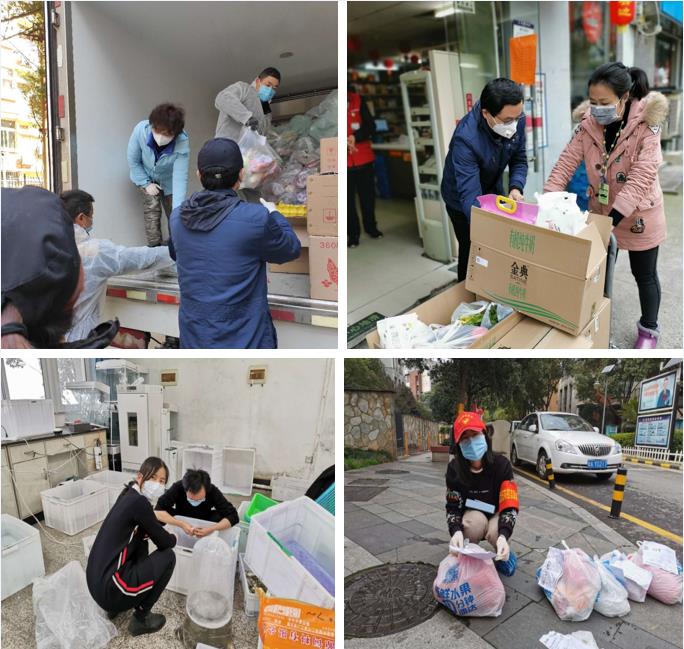 除了坚持园区消毒和保障正常运转,东西家属区近700户的生活保障一直让她牵挂不下。1月28日上班,吴珺例常去所门口中百超市查看当日生活物资情况。当她看到蔬菜寥寥无几,生鲜货架上空空荡荡,部分职工在群里反映没有菜吃,她心急如焚。她马上向物业公司寻求帮助,于是公司内部的购菜平台“武房小店”向水生所开放购买渠道,从1月30日起向所内职工和社区居民供应蔬菜,直到社区购物平台开放。最初的团购平台管理并不完善,购买的蔬菜没有分拣,到货之后,她就招呼物业的同事们一起帮忙称菜分菜,最多的一次分拣了220份。随着越来越多的志愿者加入,每次物资到了之后,群里喊一声,报名分发物资的人数瞬间就满了,分拣的效率也大大提高了,这让吴珺的心里暖暖的。