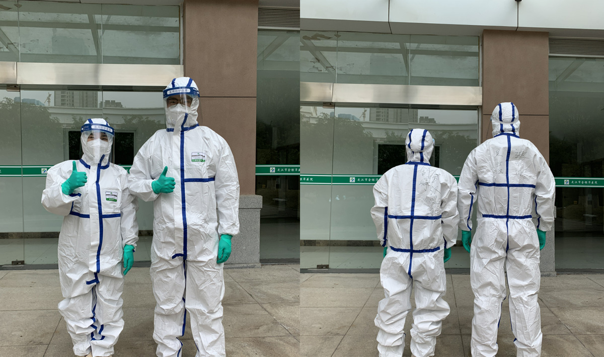 进入武汉市金银潭医院检验科大楼前,在背后写上名字以及武汉加油、武汉必胜