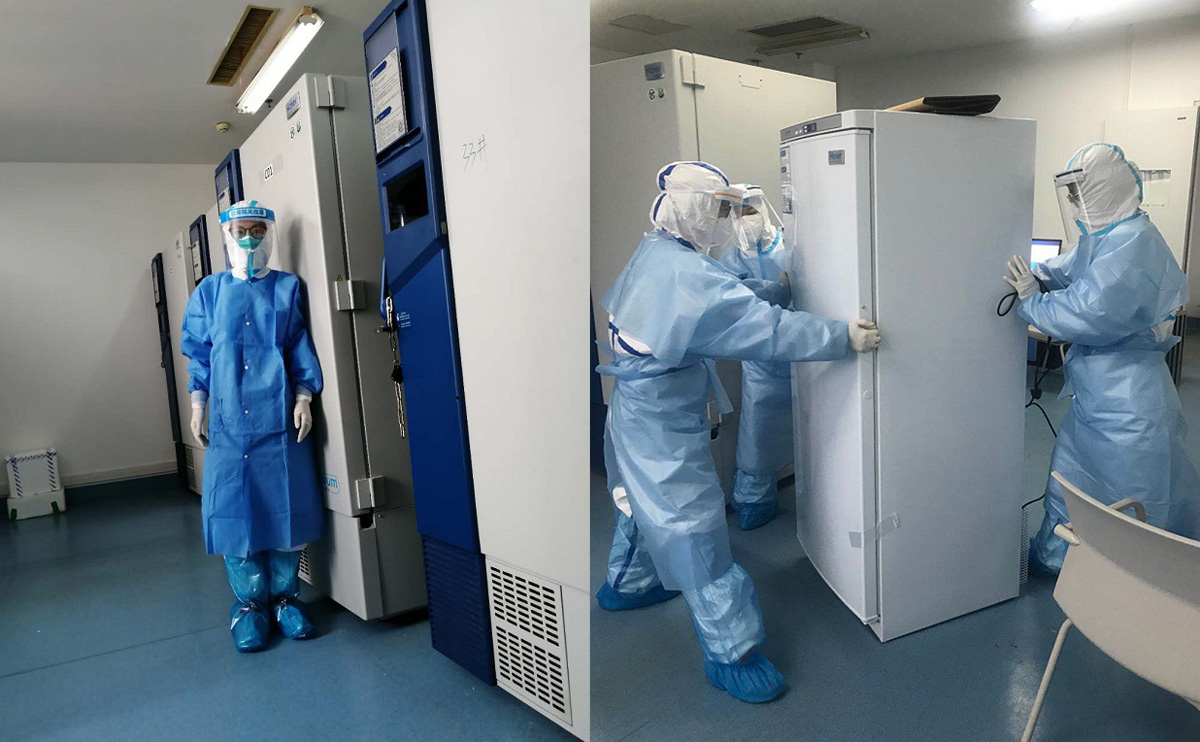 与感染性样品近距离“打交道”的他们是直面病毒的高风险暴露人员,随时都面对感染风险,特别是在处理血液样品时,因为加热导致气压变大,存在着储存管盖子被冲开,样品喷到手套上的风险。但他们来不及考虑更多,病毒学专业出身的他们,严格按照生物安全管理规范,尽可能发挥所学所长,安全、高效地开展工作,身体力行为抗击疫情贡献力量。杨庆雨为了全身心投入工作,直接住进了医院员工宿舍,将1岁半的儿子交给爱人独自在家照顾。由于样本量大,他们面临着高强度的工作,穿上密不透风的连体防护服,一工作就是连续4、5个小时,不能喝水,不能上厕所。分装处理、分类存放样品,记录并上传样品信息……每一步操作都慎之又慎,每一个信息都反复确认。因为他们深知每一份样品都弥足珍贵,对样品的后续研究将为治愈新冠肺炎患者提供科学、有效、有力的数据支撑。