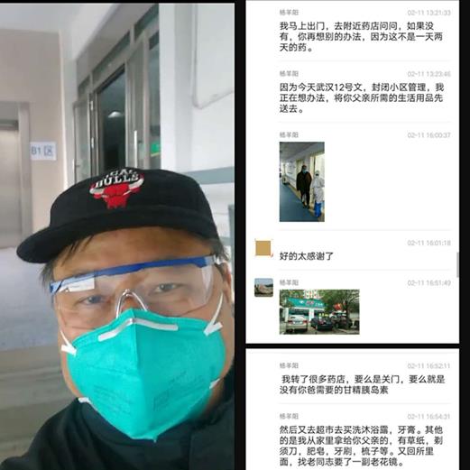 其次,遵照武汉分院防控应急措施的文件和所党委、所领导统一安排部署,杨文眷始终以离退休“三自管理”联络小组为抓手,密切联系和关注每位老同志。1月24日开始普查每位老同志的去向及状况,做到零报告,他几乎每天主动地联系居家生病老同志,了解其身体情况变化,并及时传达所领导的关心。并利用从妻子处学到的新冠肺炎的发病特征及相关常识,帮助和鼓励老同志积极应对,消除心理不适反应。