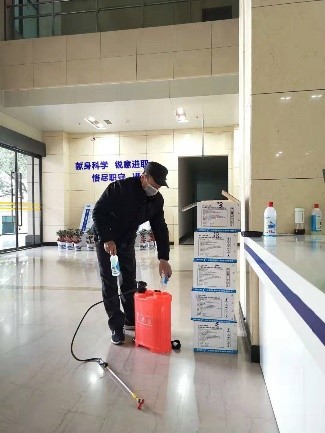 及时普及安全防护知识和疫情期间注意事项。特别是酒精、75%乙醇消毒液的使用方法和禁止事项,防止火灾发生。部署后勤部门做好园区的基本安保工作。根据防疫形式,对小洪山园区和东湖园区出入口及时作出管理安排。加强对办公楼进出人员登记管理,适时封闭管理园区和大楼,减少人员流动。园区巡逻队24小时不间断巡逻,配合园区各方加强管理,降低疫情传播风险。同时做好办公区域,如办公大楼内大厅、走廊、卫生间的消杀工作,特别是重点场所(有确诊的、疑似职工的办公室)和重点部位(电梯)的消杀。