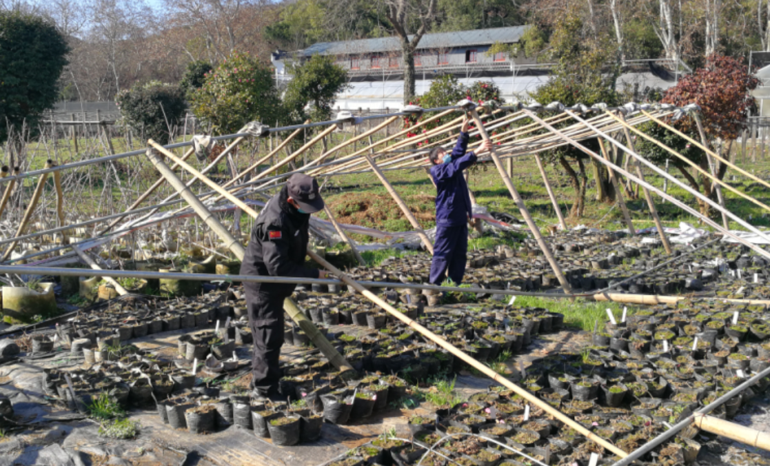 处理因风雪倒塌的实验荫棚