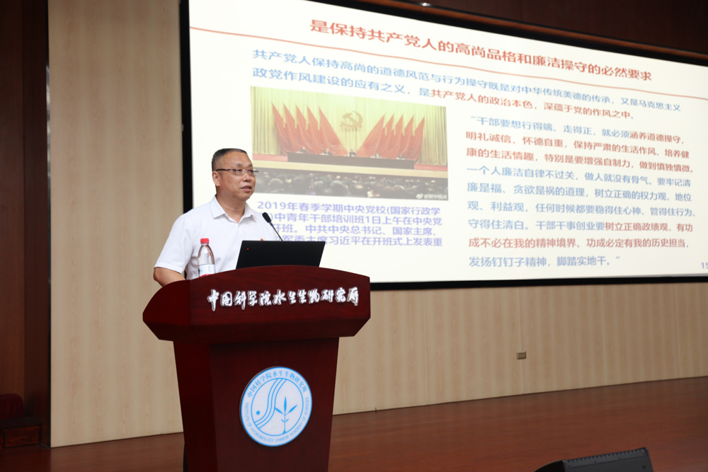 党委书记解绶启作题为《加强党风建设,抢占科技高点》专题党课报告。报告从党风问题关乎党的生死存亡、弘扬党的光荣传统和优良作风、纠正“四风”不能止步、党性问题是改进作风的重要着眼点、持之以恒抓常抓细抓长等五个方面,全面回顾了党的作风建设历程,强调作风建设是党的重要政治优势,要弘扬党的光荣传统和优良作风,持之以恒推进作风建设常态化长效化。报告同时讲述了秉志、王家楫、伍献文、刘建康、陈宜瑜、曹文宣、陈启鎏等老一辈科学家克己奉公、尚俭戒奢、甘于奉献的高尚品格,分享他们将报国情怀融入科学人生的感人故事,勉励广大党员干部紧紧围绕抢占科技制高点核心任务,深入贯彻中央八项规定精神学习教育,当好宝贵历史传统的弘扬者、新时代科学家精神的书写者、优良作风学风的践行者,营造风清气正的创新环境,以作风建设的实际成效为早日实现“四个率先”和“两加快一努力”目标、建成科技强国提供有力保障,在新时代抢占科技制高点的新征程中书写科技报国新篇章。
