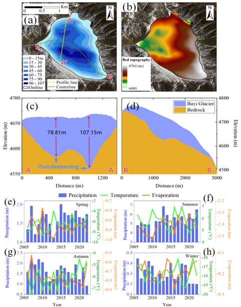 研究发现,八一冰川面积从2006年的2.68 k㎡缩减至2023年的2.36 k㎡,减少了12.17%,每年缩小的面积为2.7个标准足球场。平均冰厚从54.2m降至45.16m,最厚处减少了12.5m。冰川体积从0.153 km3骤降至0.1065 km3,锐减30.39%,消失的冰量相当于3.2个西湖。此外,八一冰川剖面可知,冰下地形存在两个“Overdeeping”区(图a-d)。这是因为,夏季6-9月平均气温以每年0.15℃的速度上升;年固态降水量以2mm/year的速度减少,冰川“补给”持续萎缩,此外,夏季液态降水增加导致蒸发量飙升,形成“消融-蒸发”恶性循环(图e-h)。研究结果突显了航空和地面综合观测在冰川学研究的重要性,建立的高精度冰川厚度和冰下地形数据,为冰厚模型参数校准和未来演化研究提供了珍贵的数据基础。