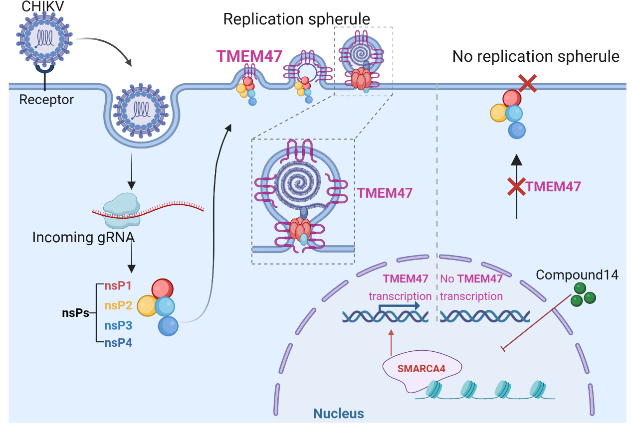 图2.SMARCA4-TMEM47调控CHIKV复制的模式图