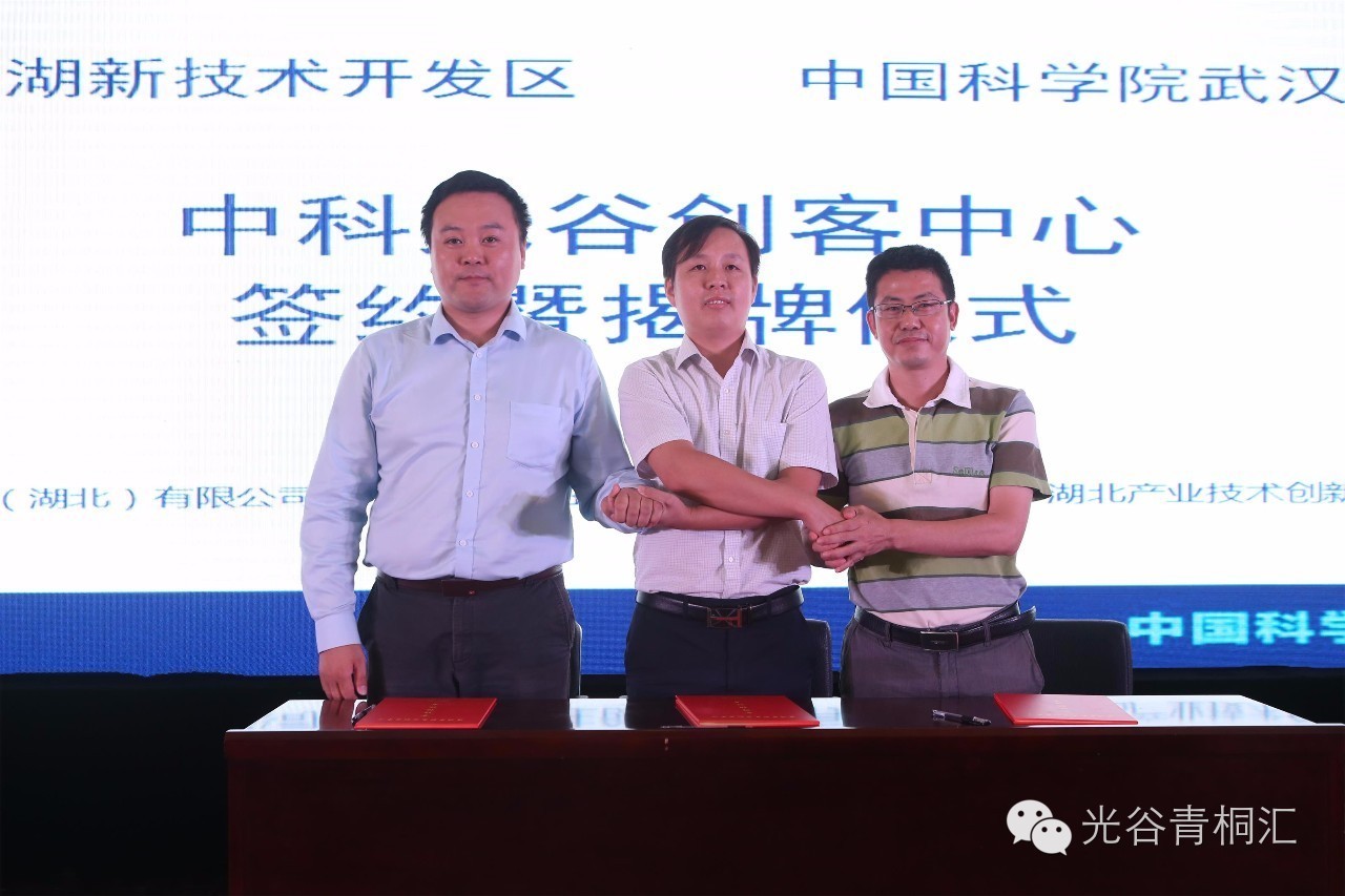 ▲中科产业育成(湖北)有限公司、武汉留学生创业园发展有限公司、中科院湖北产业技术创新与育成中心签署《三方共建中科光谷创客中心协议书》,中科育成总经理郑晨先生;光谷科技金融副总经理、武汉留创发展总经理何科方先生;湖北育成中心主任王勇先生在活动现场完成了签约仪式。