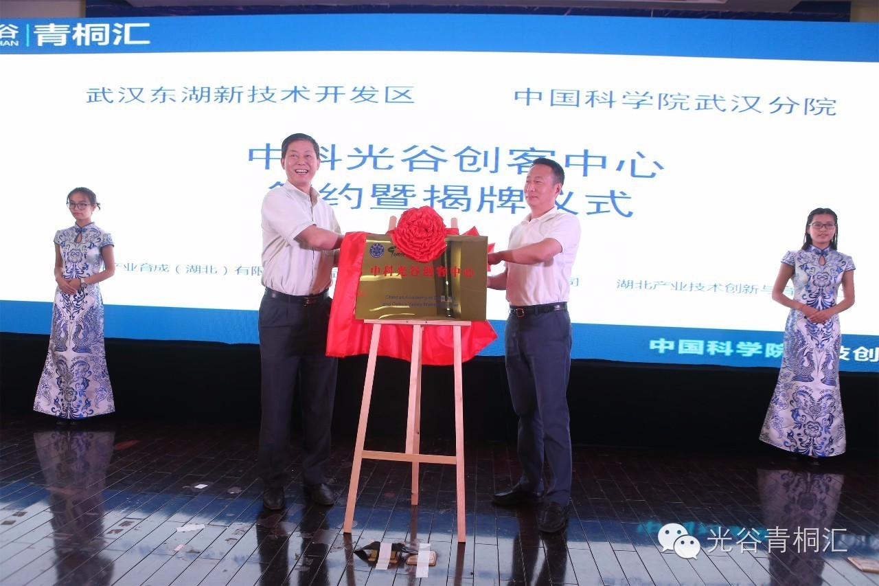 中科院武汉分院院长袁志明,东湖高新区管委会副主任夏亚民为中科光谷创新中心揭牌!(现场主持人大琦为庆贺双方合作的新高度,太激动了,不小心将夏主任的名字念成了袁亚民,直接就成一家人了哟~)